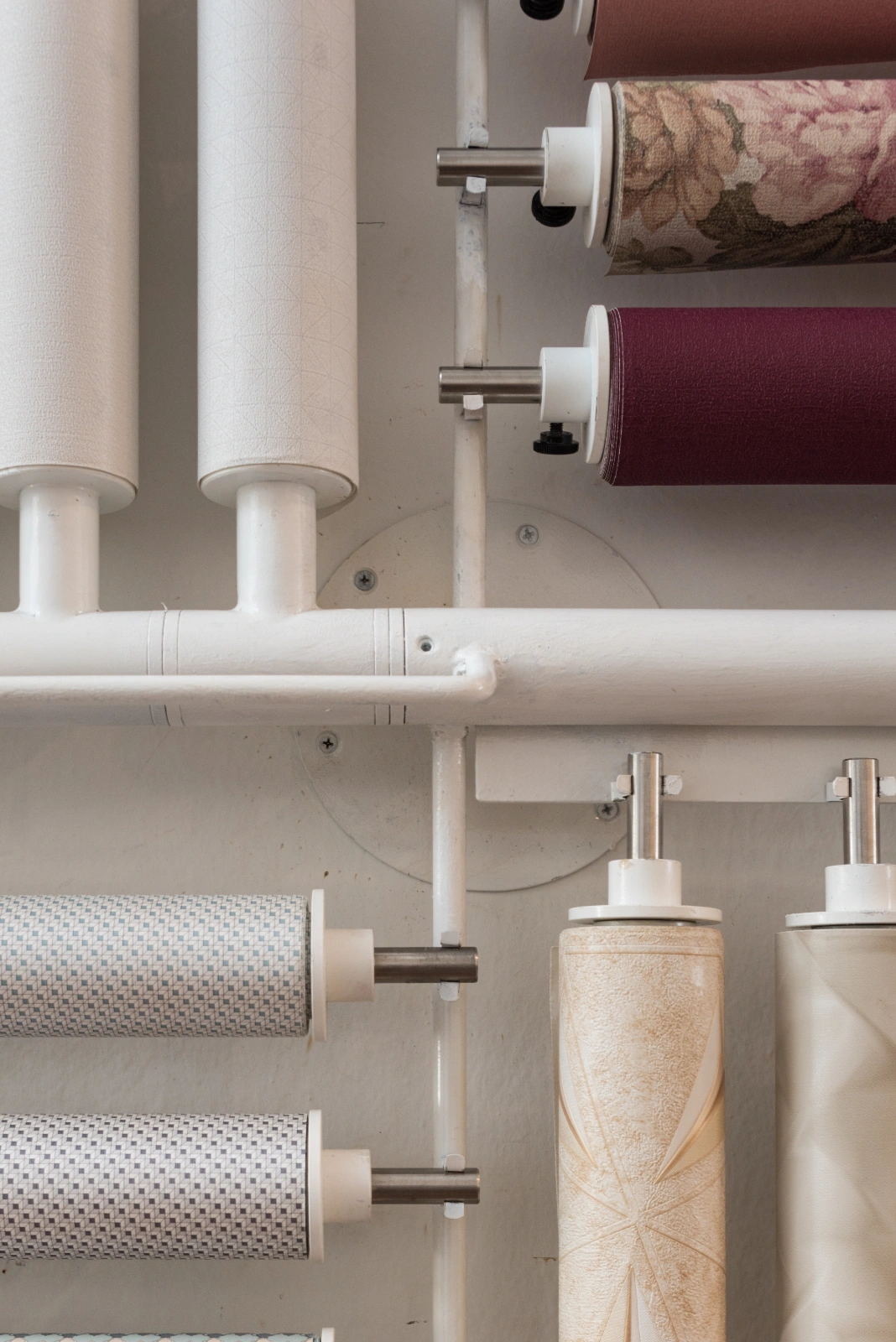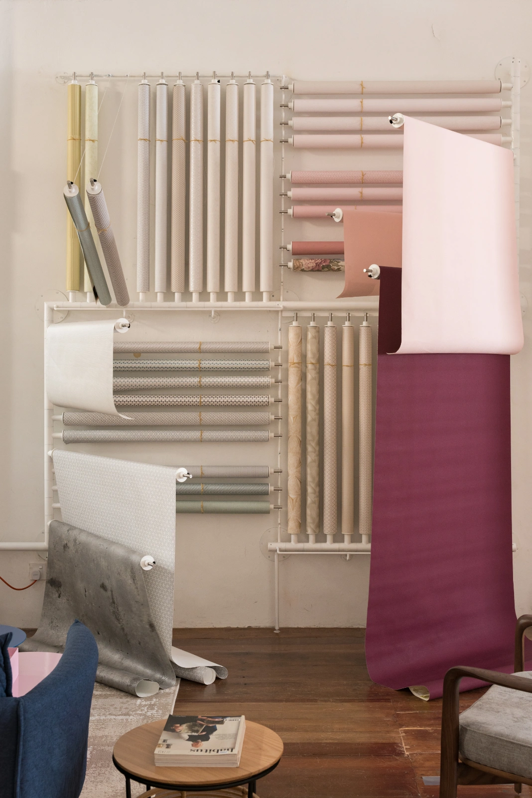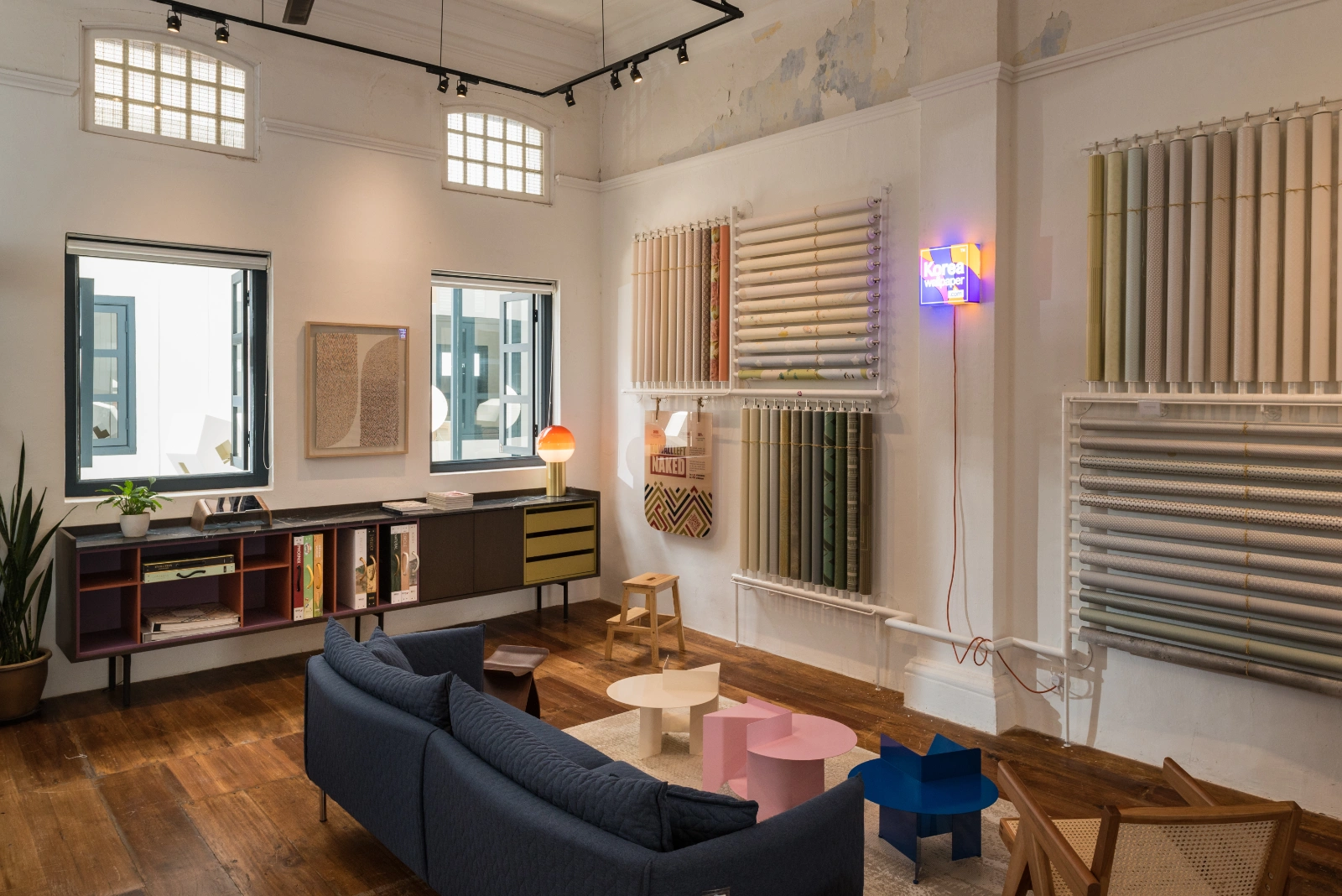 Exploring spatial and architectural strategies to redefine the experience of wallpaper display at Korea Wallpaper’s retail store, where vertical and horizontal metal tubes pivot along orthogonal axes, allowing wallpaper surfaces to unfold and expand when needed. This kinetic display system transforms the act of selection into a spatial experience, offering customers an enlarged visual field while inviting direct engagement with the wallpaper’s texture, materiality, and tactile presence.