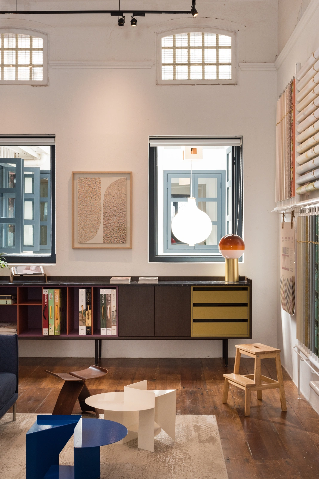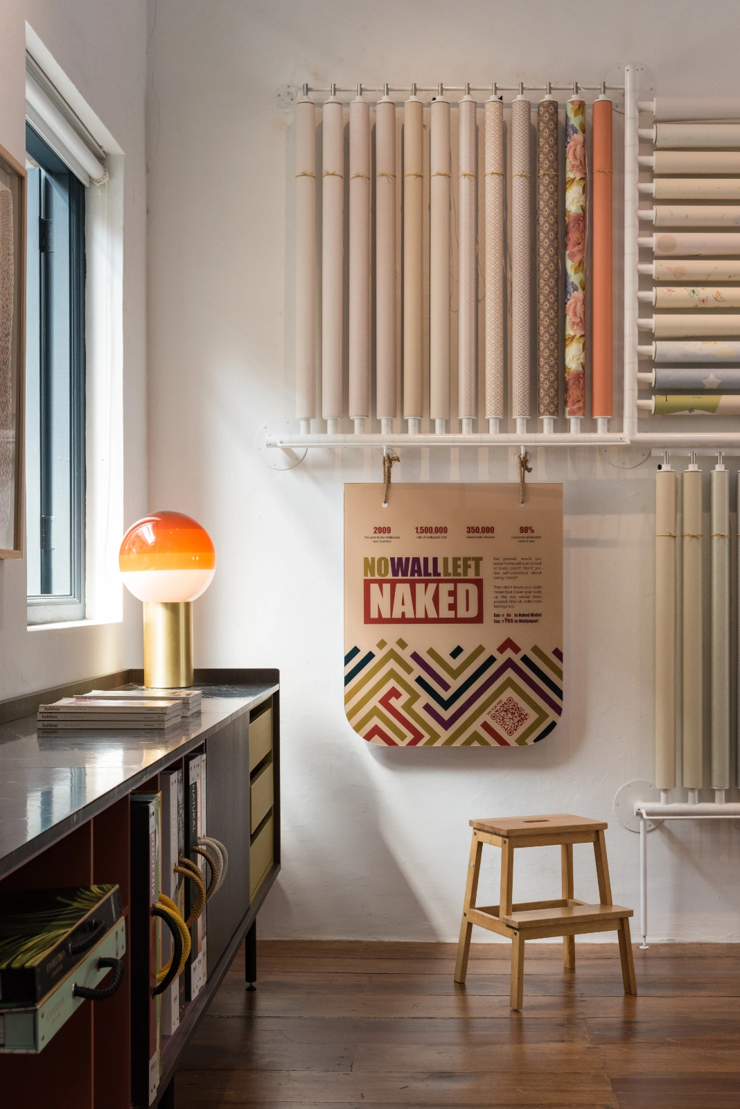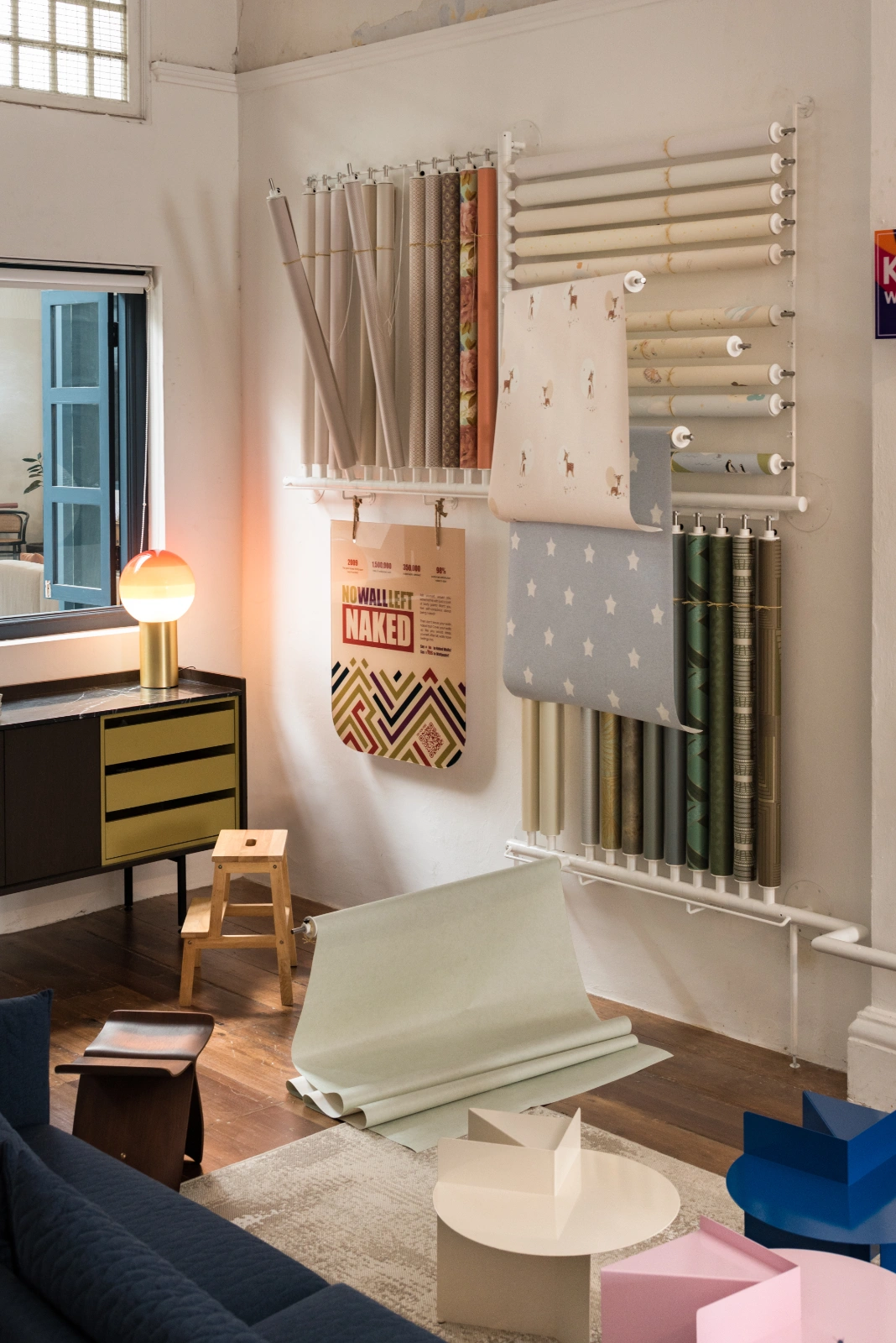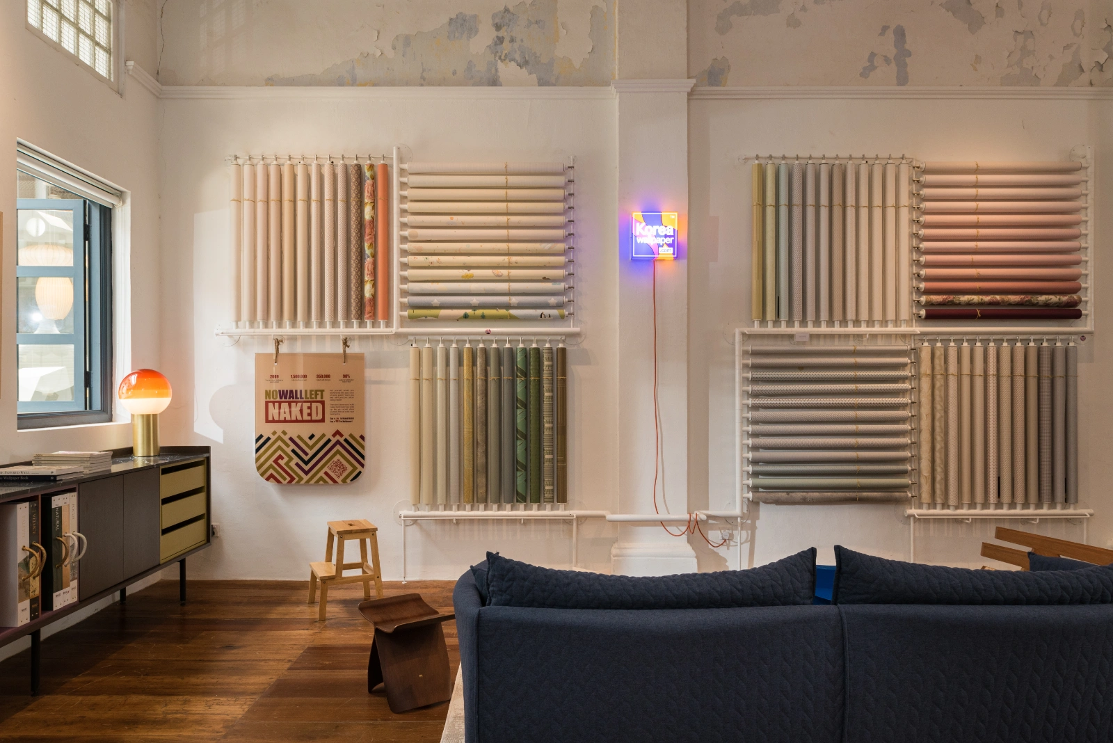 Exploring spatial and architectural strategies to redefine the experience of wallpaper display at Korea Wallpaper’s retail store, where vertical and horizontal metal tubes pivot along orthogonal axes, allowing wallpaper surfaces to unfold and expand when needed. This kinetic display system transforms the act of selection into a spatial experience, offering customers an enlarged visual field while inviting direct engagement with the wallpaper’s texture, materiality, and tactile presence.