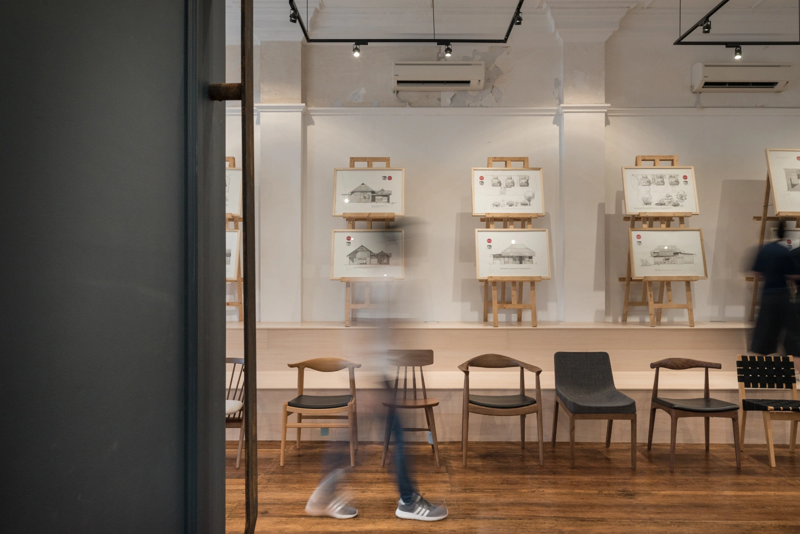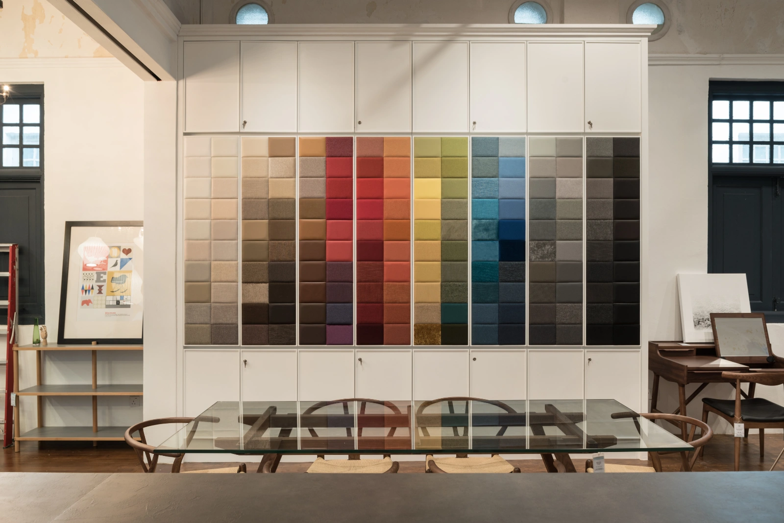 On the upper floor, layers of paint from different eras created natural palimpsests, subtle watercolor-like hues shaped by temperature and humidity. To honor the building’s history, the upper portions of these walls were left untouched, providing a poetic backdrop for furniture displays, antiques, and the restored architectural details.